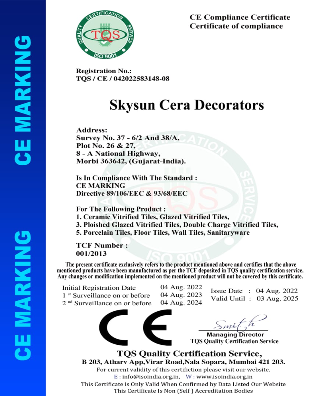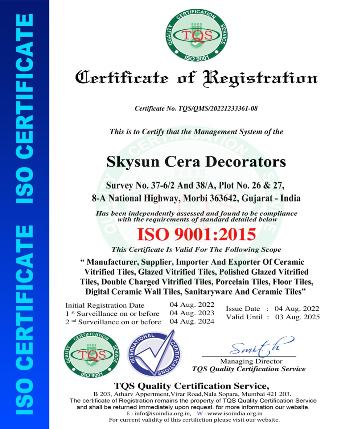 Since 2008, Skysun Cera Decorators., has gone through a long trajectory of improvement, renovation and updating in the production of tiles, going from the manual elaboration of a few meters of clayware and deccor . a journey which began its innovative face at state of the art facilities located in the heart of the Ceramic manufacturing City Morbi. With art and knowledge we contributed our efforts that makes us name in ceramic Industries. Let Skysun Cera Deccorators keep influence and inspire manufacture and designer in ceramic industries through its art of collection.